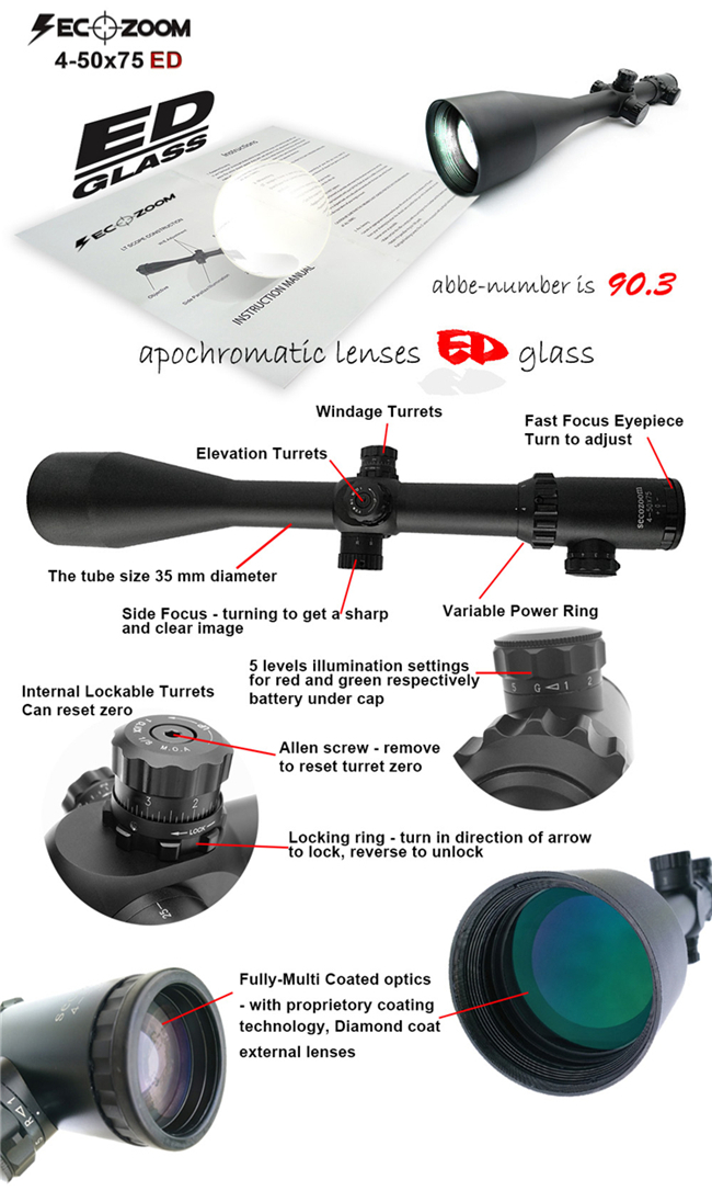 4-50x75 Tactical Hunting ED Lens Rifle Scope With Green Red Black Dot Choices Images |